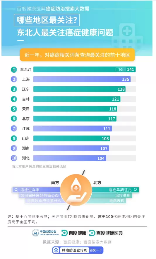 同时,对癌症相关词条查询关注度最高的前十省份中,黑龙江、上海、辽宁、吉林、天津用户的关注度位于前列。在学习癌症知识这件事上,以东北人代表的北方地区意识相对更强。