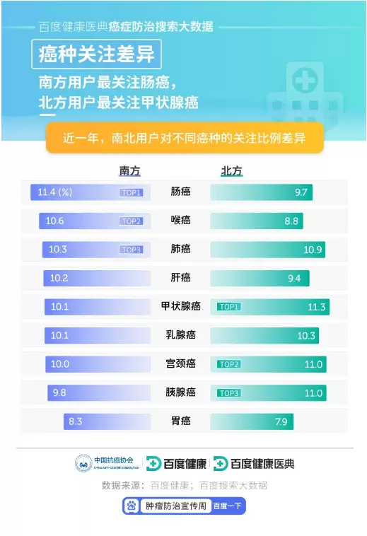 从网友搜索的问题来看,癌症治疗依然是关注的焦点。例如,北方用户关注某类癌症的早期症状、表现与治疗费用。南方用户在搜寻某类癌症的生存率、抗癌心态与患癌饮食。从具体的癌症种类来看,南方网友搜索最多的癌症分别是肠癌、喉癌和肺癌,而北方用户搜索最多的分别是甲状腺癌、宫颈癌和胰腺癌。患癌是一个家庭的大事与难事。作为难以承受之痛,生存率、治疗费用等指标很现实,但通常根植在抗癌的坚强心态当中。这进一步强调了预防的重要性,而不至于耽误时机而身陷悔恨。