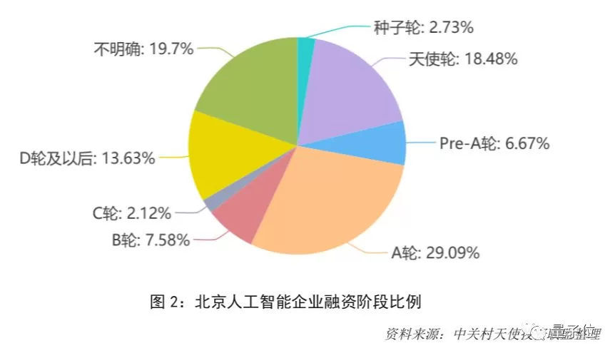 整体来说,北京AI公司融资阶段在A轮之前的企业总占比达56.97%,一半以上仍处于初创期。