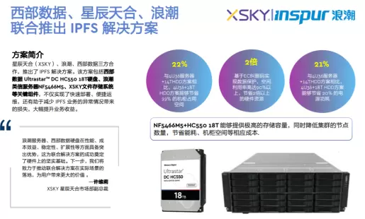 西部数据、浪潮、星辰天合多方携手,联合推出IPFS 解决方案,在软件层面搭载了专为 IPFS 场景而生的 XSFS(XSKY Scalable File System)系统,并在硬件层面涵盖了浪潮英信服务器 NF5466M5、西部数据 Ultrastar DC SN840 SSD、Ultrastar DC HC550 硬盘以及 Ultrastar Data60 JBOD 存储平台。该联合解决方案显著节省服务器采购、机柜空间、能耗等相关成本;一个分区的读取时间控制在 20 秒以内,效率显著提升,并大幅降低存储数据丢失或损坏的几率,减少异常事件的发生。