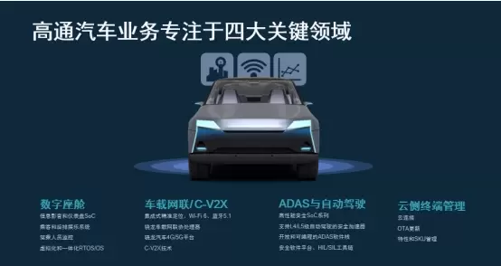 深耕汽车领域近20年,高通的汽车解决方案已赋能全球超过1.5亿辆汽车,涵盖四大关键领域——车载网联和蜂窝车联网(C-V2X)、数字座舱、先进驾驶辅助系统(ADAS)和自动驾驶、云侧终端管理。