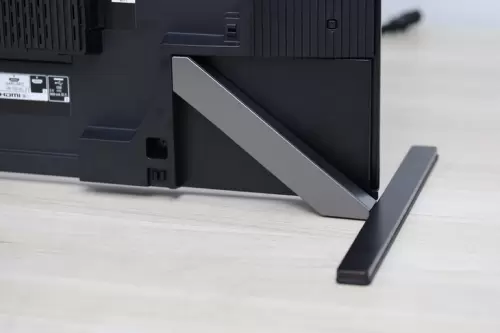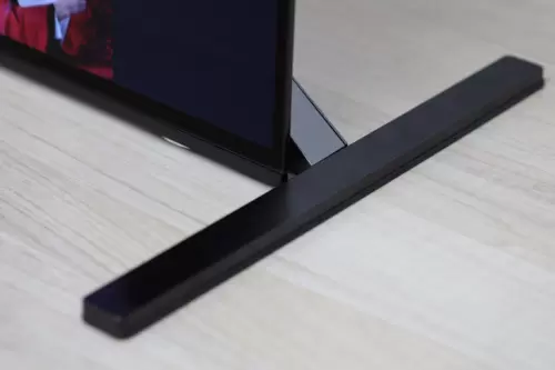 上一代A9G使用了一个圆角长方形金属支架撑起整台电视,使得底部框架距离桌面非常近,只有6mm距离,几乎与桌面融合在一体。A90J沿用了这种视觉上隐藏底座的设计,并且在功能上做出了提升。A90J使用了一个双向支架,这个支架有着两个孔位,安装时可以提供不同支架选项,当支架放置于最外侧时,可以降低对视觉的干扰;同时为了方便用户搭配回音壁以及Soundbar等设备还可以将支架内收提高进行搭配。