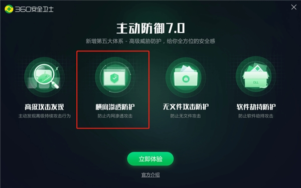 终端战场是守护用户用网安全的最后阵线,面对日趋复杂的威胁和攻击,360安全卫士的防“横向渗透”功能无疑从本质上提升了内网用户抵御勒索病毒、APT等高阶网络威胁的能力。目前,360安全卫士产品功能已全面升级,用户可下载最新版360安全卫士,前往功能大全、安全防护中心等入口,一键开启“横向渗透”防护功能,共同铸就企业内网安全的“铜墙铁壁”。