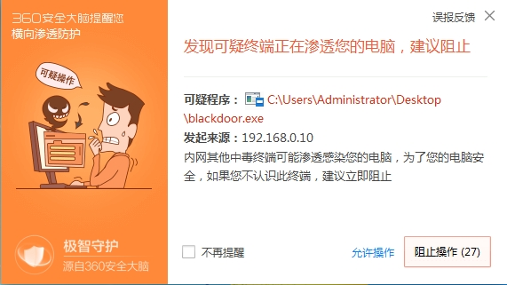 为避免局域网用户遭受横向渗透攻击的威胁,360安全卫士防“横向渗透防护”功能作用体现在两方面:一是拦截,二是发现。当用户下载360安全卫士并开启“横向渗透”防护后,一旦发生其他设备尝试攻击并进行远程启动操作等高危行为时,360安全卫士即可第一时间发现拦截,并通过弹窗及时提示用户。让隐秘的渗透攻击可见可防,又在防御外部威胁入侵内网环境的同时,将已入侵活动锁死在小范围内,避免勒索病毒等网络威胁流窜内网,击穿企业数字资产。