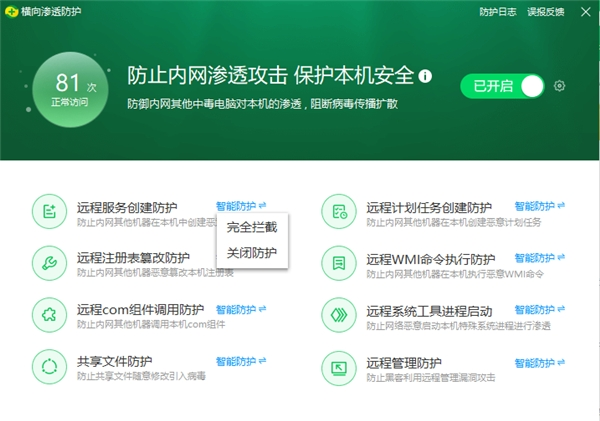 此外,360安全卫士防横向渗透功能支持智能防护和完全防护两种模式。在智能防护模式下,当其他机器尝试攻击并进行远程启动操作时,安全卫士能够及时发现并拦截弹窗提示用户,有效保护用户电脑的安全。在完全防护模式下,针对所有的横向渗透行为,360安全卫士会默认进行拦截,极大节省了用户的操作时间。