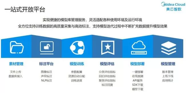 面向业务人员的业务建模平台,为非专业算法工程师的业务端提供一站式、快捷的建模平台:拥有素材管理、标注平台、模型训练、模型评估、模型部署、模型管理等功能,使用时只需“创建项目、导入素材、素材管理、模型管理和模型部署”简单五步,即可将声音分类、图像分类、物体检测等进行场景化结果输出。