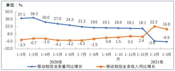 图:2020-2021年1-3月移动短信业务量和收入同比增长情况
