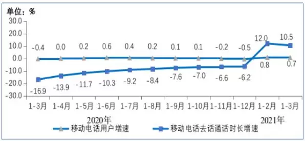 图:2020-2021年1-3月移动电话用户增速和通话时长增速