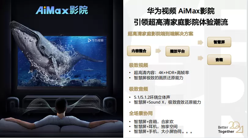 当宅家成为一种新经济,家庭影院的需求也提上了日程。华为视频推出的AiMax影院集4K、HDR、5.1环绕声一体,以满足这一需求。徐晓林介绍,截止目前,AiMax影院已引入高清优质影片近400部,未来还将开设AiMax剧场,引入符合AiMax标准的更多品类的视频内容。
