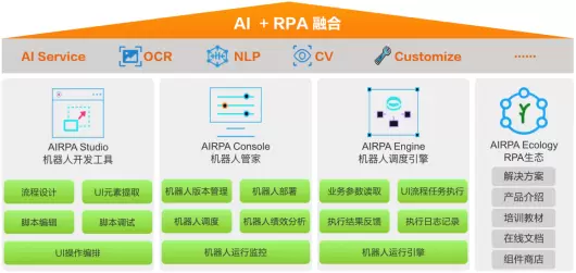 AISWare AIRPA将机器人流程自动化与亚信科技“智慧大脑”融合,形成了流程机器人开发平台、机器人调度运行平台、机器人管家、AI服务组件、RPA生态社区5大核心能力板块,提供跨平台、跨系统、跨应用的流程集成能力,依托自动化手段为企业/机构承担高重复、低效率的事务性工作,通过数据智能方式实现流程数据异常自动发现、流程变化自动识别、流程知识自动积累,帮助各行业客户打破效率瓶颈,探寻价值洼地,推进转型升级。