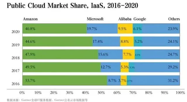 Gartner在调查报告中指出,去年全球云计算市场规模达到了642亿美元,同比增长40.7%,其中阿里云在过去五年中市场份额提升近300%,微软也有200%的体会是能。虽然亚马逊有所下滑,但目前依然在云计算市场中独占鳌头。
