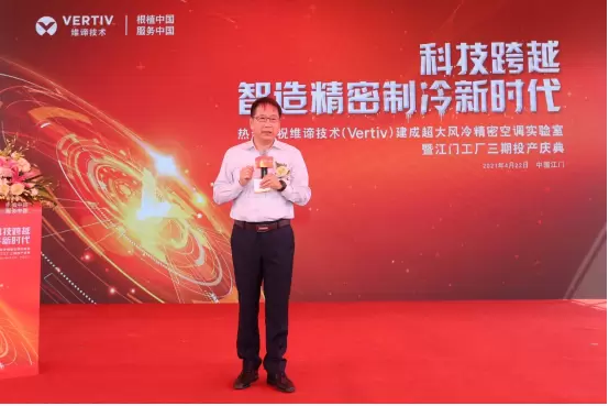 维谛技术(Vertiv)北亚区总裁祝金程先生在庆典现场致辞,对到场的领导和嘉宾表示欢迎,对江门市政府与维谛技术(Vertiv)的大力合作表示感谢。祝金程先生表示,江门工厂三期及新建空调实验室项目具有重要的里程碑意义,与国家倡导的碳中和以及有效节能政策保持一致。