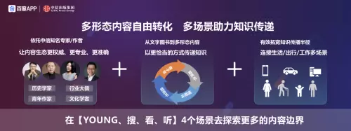 此外,百度还将联合中信出版打造服务于“听场景”的新型内容产品,针对不同属性的用户开发分层语音读物,将原著进行分级解读,甚至结合语音合成产出不同朗读风格的产品版本,让优质内容降低传播门槛,触达更多用户。