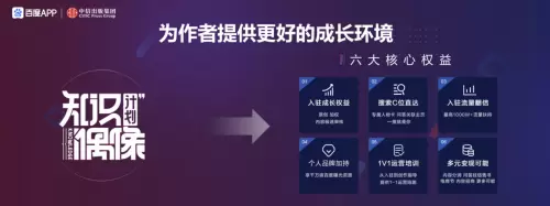 此次发布会上双方宣布,百度百家号将与中信出版集团联手发起“知识偶像计划”,为文化、育儿、旅游、健身、情感等五大领域的签约创作者提供流量支持,并进行内容孵化,通过付费专栏、精品栏目、电子售书等形态探索商业闭环与服务闭环形成的可能性,赋能创作者成长。