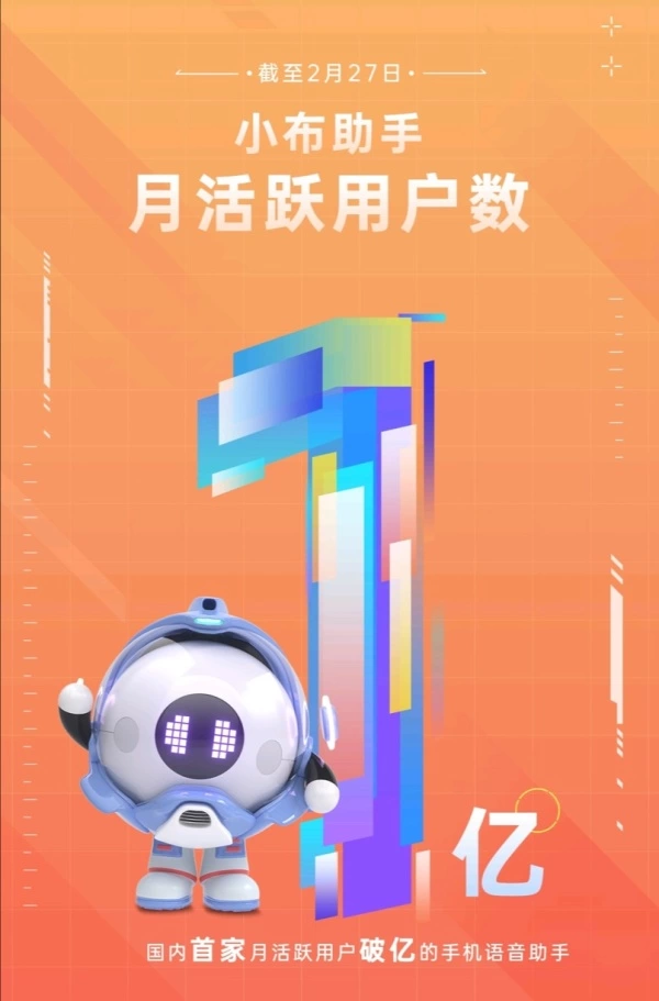截至2021年2月27日,OPPO小布助手月度活跃用户数突破1亿,成为国内首个月活用户数破亿的手机语音助手。