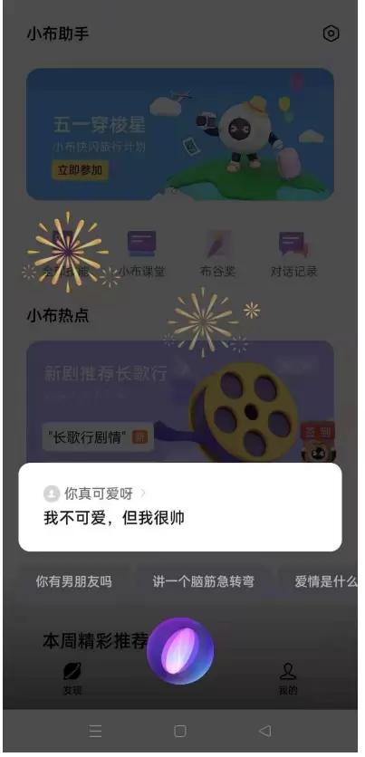 用户切换到“智趣男声”音色后,小布可以对用户的声音做情绪识别,并给出多样化的情感反馈,包括温情的文本回复、具有情绪变化的TTS音色、暖萌有趣的UI视觉效果。当小布感知到用户的情绪为开心/感激/夸赞时,小布的声音会变得很开心去表达对用户的喜欢,并触发开心类的视觉动效。比如用户说:“我很开心/你真可爱呀/谢谢你”,小布播放满屏的烟花。