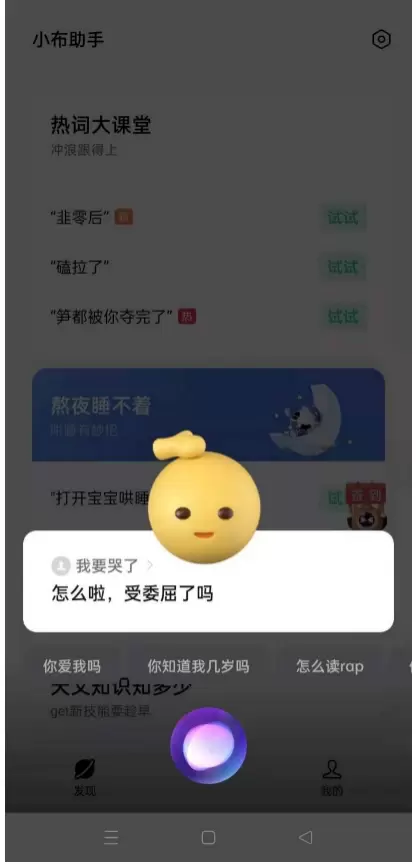 当小布感知到用户的情绪为难过低落时,小布的声音会变得很温柔去安慰用户振作起来,并触发安慰类的视觉动效。比如用户说:“我要哭了/我心情不好/我失恋了”,小布摸了摸用户的头。