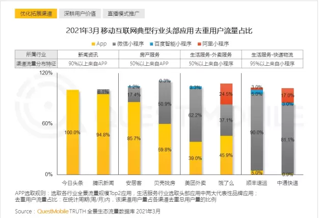 具体来看,各大玩家基于其应用功能特征,进行流量渠道布局,形成行业性差异。2021年3月,在渠道流量分布上,新闻资讯90%以上来自APP,今日头条和腾讯新闻流量规模占据行业前二;房产服务50%以上来自APP,安居客和贝壳找房流量规模占据行业前二,快递物流则95%以上来自小程序,顺丰速运和中通快递流量规模占据行业前二。