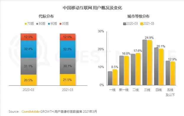 QuestMobile《春季大报告》显示,2021年第一季度,移动网民整体规模趋稳,随着时间呈现阶段性波动变化。不过,与2019年相似的是,移动网民规模在2020年9月份回落到低点之后再度呈现增长态势,只是增长规模较上一阶段同期有所缩小。