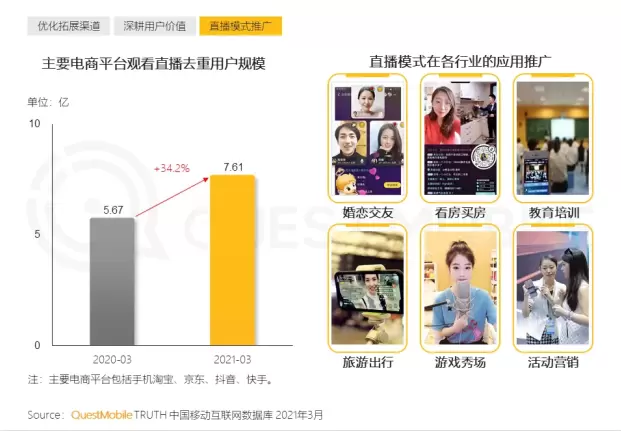 值得一提的是,直播已成为电商销售的重要方式,用户规模实现快速增长,在不同行业也得到了进一步应用和推广。2021年3月,手机淘宝、京东、抖音、快手等主要电商平台观看直播去重用户规模达7.61亿,同比增长34.2%。婚恋交友、看房买房、教育培训、活动营销等成为直播模式应用推广的热门行业。
