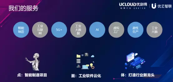 优云智联依托母公司优刻得领先的云计算、大数据、人工智能及数据流通安全技术,整合国内先进的工业互联网优秀产品,从点、面、体三维立体角度,提供智能制造服务、工业云解决方案及行业云解决方案,帮助企业实现自主注册、自主配置(企业人/机/料/测)、自主运维,以及云化工业软件低成本快速部署,降低工业软件使用门槛,让百万制造企业上云上平台成为可能。