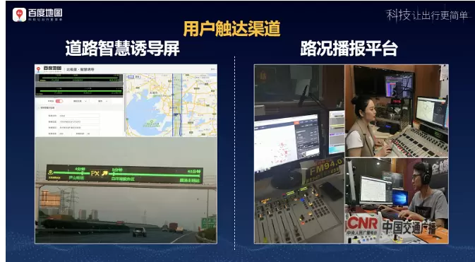 在“看”的体验上,用户除了可使用百度地图APP外,也能通过线下道路安装的智慧诱导屏获取实时路况事件信息、接收道路提示。在“听”的体验上,基于“AI路况播报平台”产品,百度地图与全国各地广播电台合作,成立“百度地图路况播报联盟”,用语音播报的方式将交通信息传递给驾驶人,减轻驾驶人视觉信息的接收压力。由此,通过“线上+线下”双渠道联动,百度地图实现了“出行用百度地图,上车听广播,抬头看诱导屏”这一立体式高速路况信息服务,可极大提升高速公路运行的安全与效率。