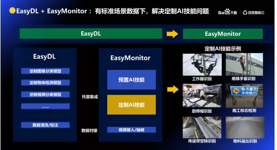 百度EasyMonitor提供一站式生产安全视频分析方案,助力企业实现生产安全监控智能化革新。EasyDL平台上定制的图像分类、物体检测、视频分类等模型,与EasyMonitor预置的丰富的场景化AI技能,两者联合从而实现在有标准场景数据下解决了定制AI技能的问题,例如工作服识别、绝缘手套识别、施工标志识别等,满足多场景化的生产安全监督需求,目前已在矿业生产等场景中落地。