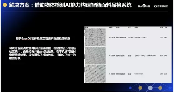 江西睿视智能装备有限公司总经理郭奕辰则剖析了百度EasyDL平台在纺织面料智能质检的实践应用案例。在纺织面料采买环节,经常存在人工搜寻面料慢、识别面料不准、采购难以比价的痛点;借助EasyDL训练面料识别模型后,模型效果达到99%准确率,并随着新面料种类引入持续快速迭代。