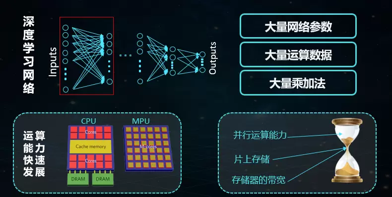 运算过程中,需要把部分需要的权重参数搬运到DRAM,再把小部分参数传入到芯片中的SRAM和eDRAM中,之后导入寄存器和运算单元完成运算。神经网络运算需要大面积SRAM和eDRAM来减少片内外数据搬运和提高运算效率,但是由于片上存储成本的限制,也需要高成本、高速度的DRAM来缓存片上无法容纳的权重参数和临时数据。