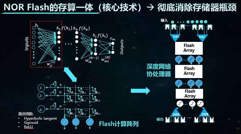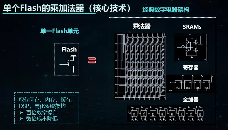 例如,只需要100万个Flash单元,就可以存储100万个权重参数,同时并行完成100万次乘加法运算。