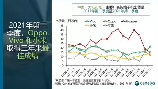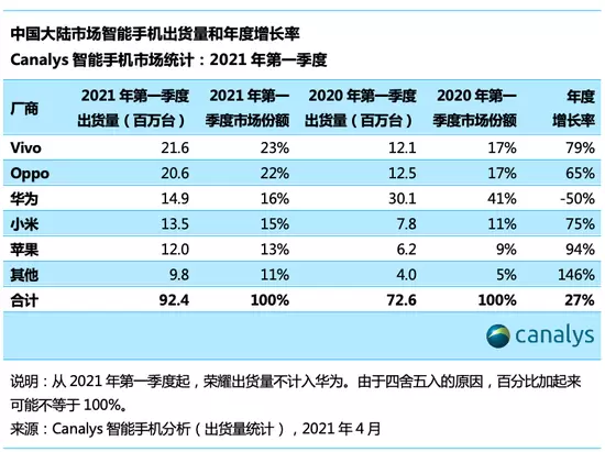 中国大陆智能手机市场在新冠疫情一周之际终于恢复到2019年第一季度的水平。智能手机出货量达到9240万部,同比增长27%。vivo从华为手中夺得国内市场桂冠,出货同比猛增79%,达到2160万台。OPPO以2060万台出货名列第二。华为下滑至第三,2021年第一季度出货1490万台(独立后的荣耀以近500万台位居第六)。小米和苹果分列第四和第五位,分别出货1350万台和1200万台。