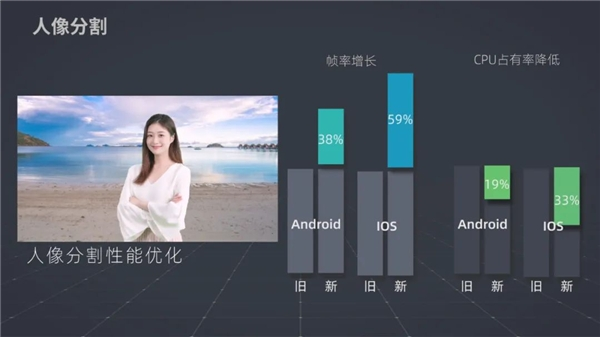 2.人像分割性能上,Andriod端帧率上升38%,CPU占有率降低19%,iOS端帧率上升59%,CPU占有率降低33%。