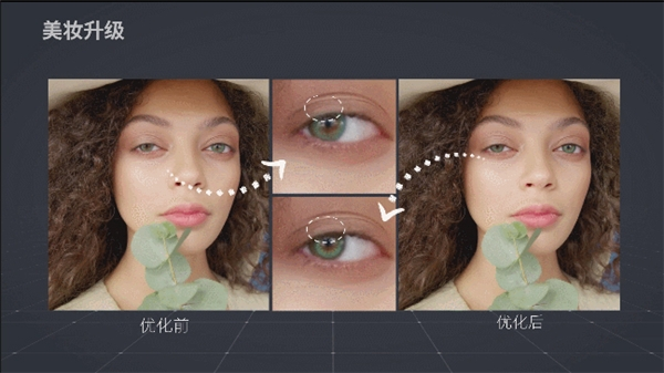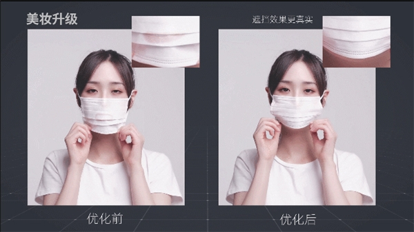 再者,针对典型场景的美妆优化,如下巴遮挡时还原真实遮挡效果,戴口罩使用效果亦佳;美瞳效果自然贴合,让你的美出于自然,高于真实。