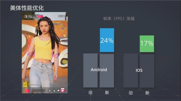 1.美体性能表现上,Android端帧率上升24%,iOS端帧率提升17%。