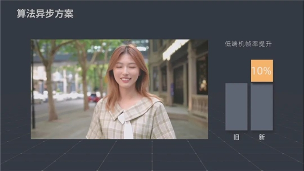3.新增异步方案接口,明显改善低端设备在使用时出现的慢速、卡顿情况,低端设备平均帧率提升10%。这主要是我们用调度算法将算法计算任务和图形渲染任务更好进行分配,从而充分利用手机计算资源,提升帧率。在测试部门历经多台陈旧、低端设备上机的测试后,展现的成果也非常惊艳。