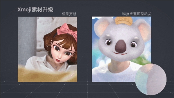 还有Animoji效果变化也非常大,素材升级,新增高精度模型;面部驱动效果得到优化,提升驱动后模型的稳定性和灵敏度;升级后,Xmoji的毛发也能清晰可见,逼真动人,这也属于业内一大创新。