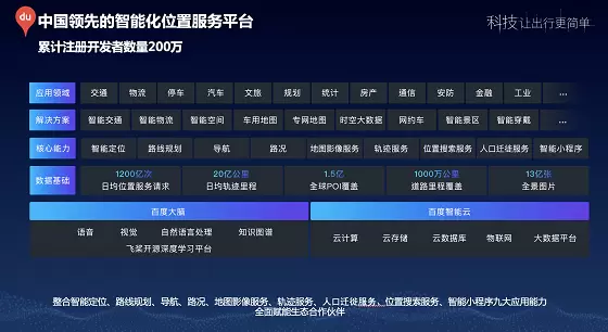 在新一代数据生产模式下,百度地图90%的数据生产环节都实现了AI化,道路里程覆盖超1000万公里,生产效率较传统生产工艺提升30倍以上。全景地图经过8年的潜心“修炼”,全景照片已突破13亿张,覆盖了国内95%以上城市的主干路网,实现50万商家入驻。基于丰富的全景数据,百度地图在公交路线规划终点、步行导航终点、POI找点、周边探索等场景中都提供了独家全景服务,让用户所看即所得,出行更便利。同时,百度地图也凭借海量的大数据积累,为广大生态合作伙伴打通了智能化升级路径,让交通、物流、生活服务等行业迈向发展的新格局。