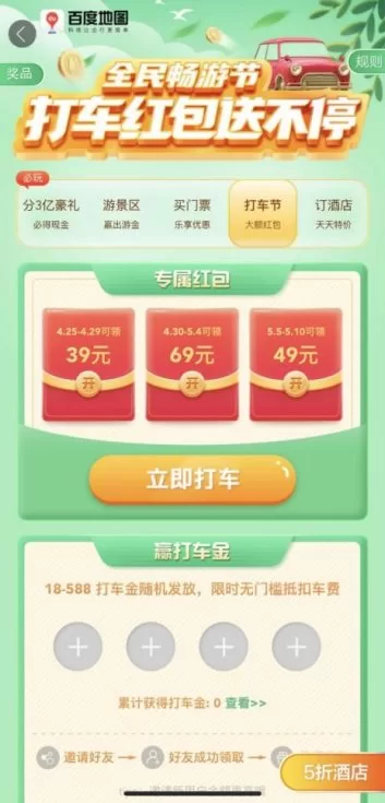 五一出行期间,比省时间更给力的,当然是省钱啦。百度地图特别为广大用户出行准备了打车专属红包、打车金、省钱券等超多福利,分分钟领到手软。同时,百度地图优先向你推荐“最便宜”和“经济快车”两种实惠的出行方式,帮用户挑选出真正的“性价比之王”。此外,邀请好友助力,双方都有机会获得18~588元不等的打车金,限时无门槛可直接抵扣打车费用,邀请新用户的话,领到的金额还会更高哦。