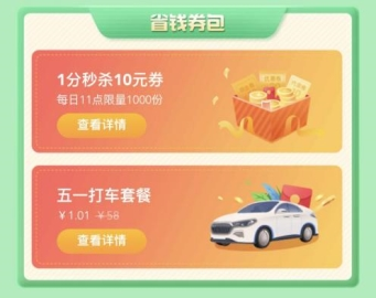 考虑到大家五一小长假期间打车频繁,优惠券不够用怎么办?百度地图准备了整点秒杀券活动,活动期间的每天11点准时开抢,限量1000份,购买成功后,在规定有效期内使用即可;错过秒杀也不用担心,还可以1.01元抢购价值58元的“五一打车套餐”。各种省钱方式,助力五一实惠出行。