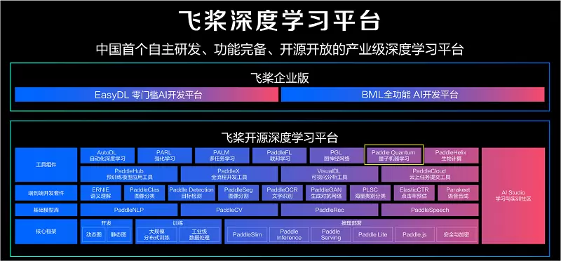 事实上,百度早在2018年便成立了量子计算研究所。到了2020年,百度基于自身开源开放的深度学习平台飞桨发布了“量桨”——支持量子神经网络的搭建与训练的量子机器学习工具集。而飞桨作为中国首个自主研发、开源开放、功能完备的产业级深度学习平台,全面涵盖核心框架、基础模型库、端到端开发套件、工具组件,以及飞桨企业版AI开发平台,可以说是为产业、学术、科研创新提供了基础技术底座。