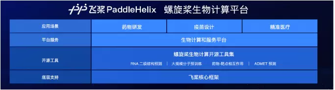 除了LinearDesign外,百度在生物计算方面积累的其他成熟经验已基于飞桨打造的螺旋桨PaddleHelix进行开源,提供包括大规模的分子预训练、药物-靶点亲和力预测、以及 ADMET成药性预测等一系列算法和模型。同时,螺旋桨PaddleHelix生物计算平台底层依旧以飞桨核心框架作为支持,有深度开发需求的开发者也可以满足自身所需。从上层应用场景来讲,PaddleHelix满足了药物研发,疫苗设计和精准医疗三大主要场景,帮助生物信息学、计算机交叉学科背景的学习者、研究者和合作伙伴,更便利地构建AI算法模型。