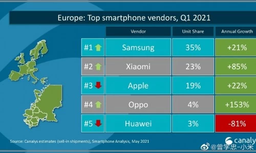 在全球5G换机潮下,中国厂商正大力开拓海外市场,并取得了显著的成效。最近,小米副总裁曾学忠在社交媒体上引用研究机构Canalys的数据指出,今年第一季度,小米在欧洲智能手机市场的份额首次排名第二。从Canalys统计数据中还可以看到,OPPO在同期增长了153%,是前五名里增长最快的厂商。