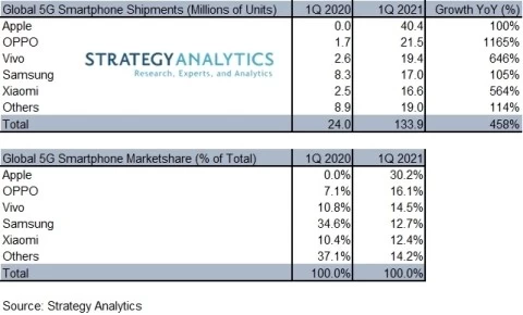 除了骁龙8系,高通还将5G扩展到骁龙7系、6系和4系,支持合作伙伴快速开发出更多价位段的5G产品,从而加快5G普及应用的速度。根据另一家研究机构StrategyAnalytics公布的数据,今年第一季度,全球5G智能手机出货量高达1.339亿部,相比去年同期激增了458%。在前五大品牌中,中国厂商占了三个席位,合计占据的市场份额达到43%。