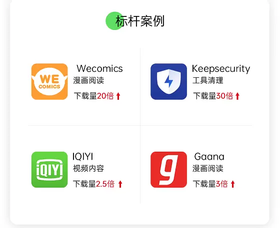 而在推广资源方面,OPPO海外软件商店为开发者提供了首页第一屏强势推荐、详情页内容卡推荐、闪屏等优质资源位。结合OPPO“引力计划2.0”扶持,将打通全场景触达及服务能力,开放亿级曝光资源合作并提供免费扶持资源,深度联动本地化及定制化运营能力,达成下载转化、ROI提升等出海目的。据了解,漫画阅读类应用Wecomics通过与OPPO海外软件商店团队合作,在该渠道的下载量提升了超20倍;工具清理类应用Keepsecurity下载量提升了30倍;视频内容类应用IQIYI下载量提升了2.5倍;漫画阅读类应用Gaana下载量提升了3倍。