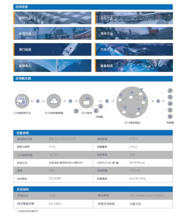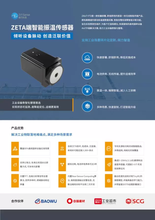 ZETA振温传感器是ZETA+TinyML典型应用的物联终端。可实现高精度、高频响振动和温度数据采集,能自动远程差分升级,轻便部署、即插即用,单网关可稳定接入300多个测点,帮助企业实现设备的预测性维护。
