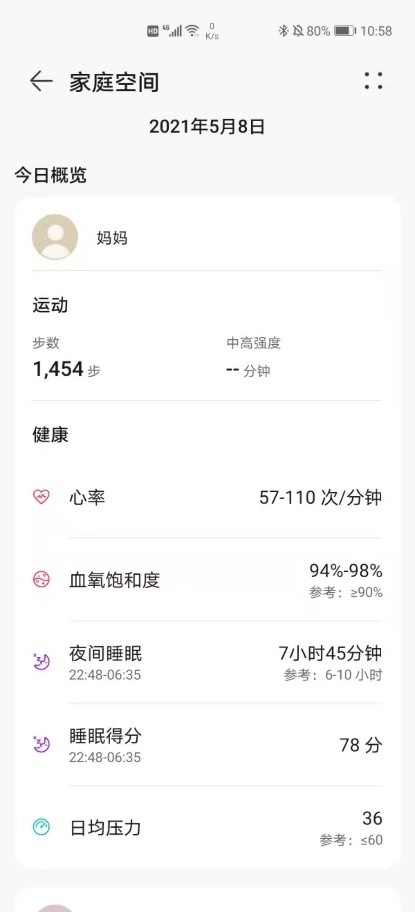 妈妈习惯报喜不报忧,总是将“放心,我很好”挂在嘴边,如果妈妈因没睡好觉或者过度劳累出现身体不适等状况,我们都无法第一时间得知。时刻关注到妈妈的健康,能让我们更加安心。通过华为家庭空间的提供关注和被关注能力,我们可以随时查看妈妈的心率、血氧饱和度、睡眠、压力等运动健康数据;如果出现异常健康数据,及时收到相应的健康提醒消息,让关怀时刻在线。