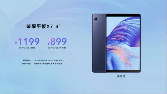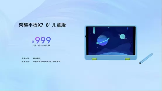 荣耀平板X7 8”系列产品拥有4.9mm窄边框,屏占比达80%,轻至325g。其中荣耀平板 X7 8”LTE版售价1199元起;WiFi版售价899元起;儿童WiFi版售价999元起。