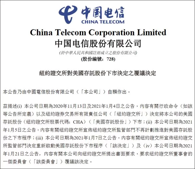 1月6日,纽交所再次“变脸”,称将继续推动中国三大电信运营商的摘牌退市,以遵守美国总统特朗普签署的一项行政命令。纽交所在当日公告中称,再次扭转此前决定是因为美国财政部外国资产控制办公室(OFAC)发布了最新的指引,该指引禁止美国投资者自2021年1月11日起和这三家中国电信公司进行特定交易。