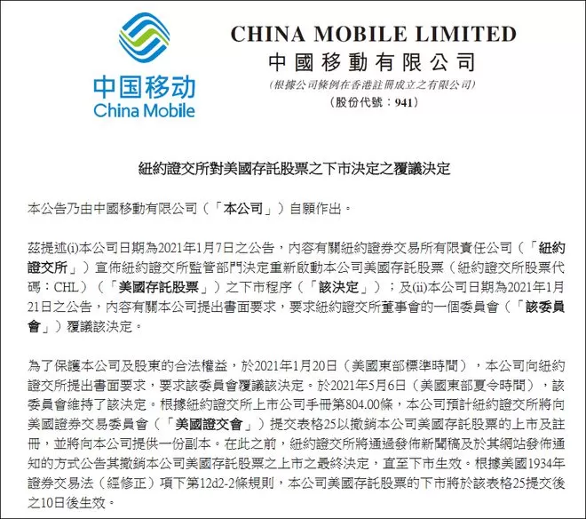 在5月7日发布的公告中,三大运营商均表示,三家中企曾于美东时间1月20日向纽交所提出书面要求,要求纽交所董事会的一个委员会再次审议摘牌决定。但5月6日,该委员会维持了原先的摘牌决定,纽交所将通过发布新闻稿及在官网发布通知的方式公布最终决定。退市将在美国证券交易委员会(SEC)接到纽交所通知10天后生效。