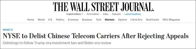 《华尔街日报》:上诉遭拒,纽交所将摘牌三家中国电信运营商